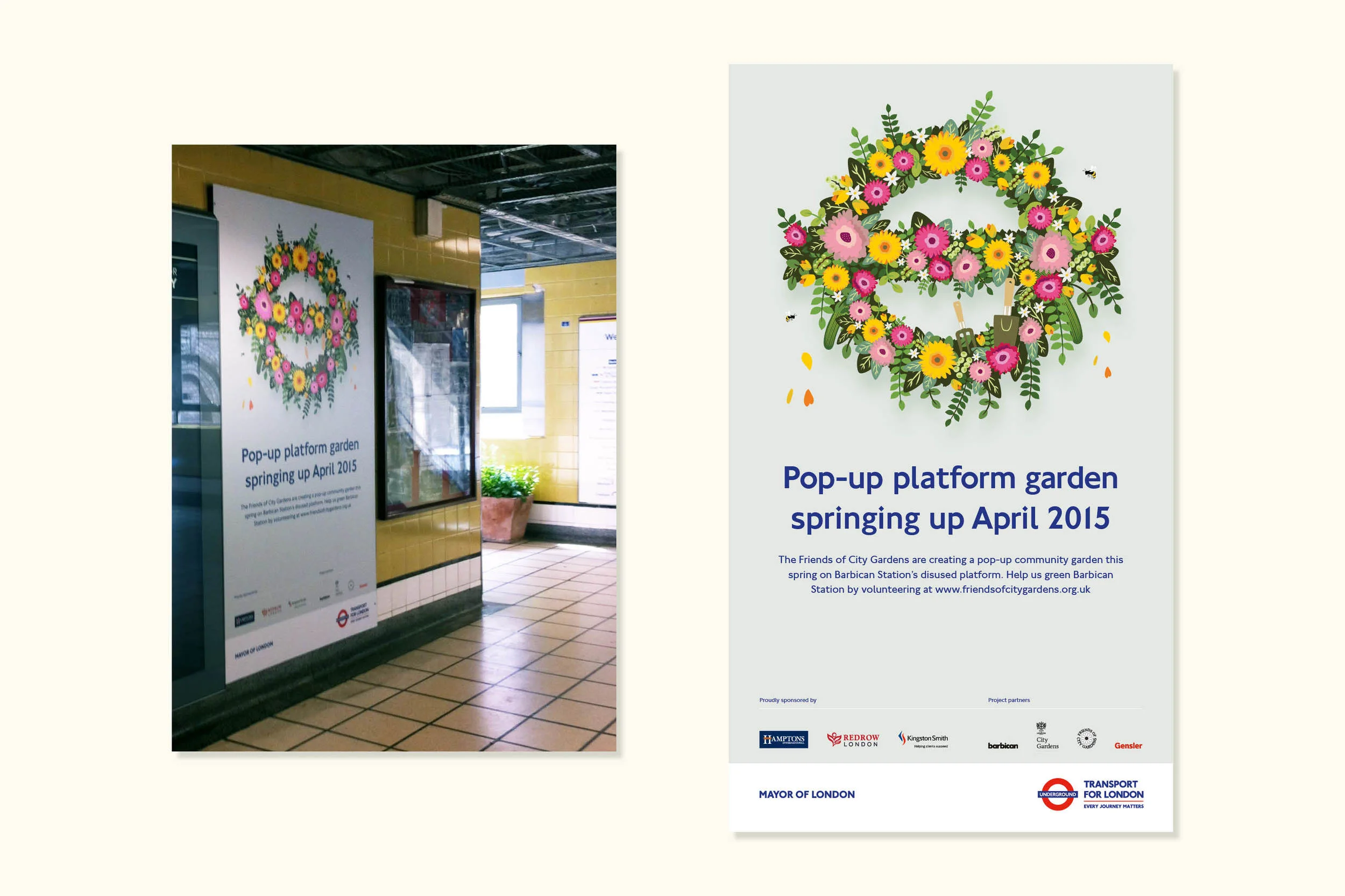 Transport for London commissioned Lydia to produce a large format illustration and poster design to promote Barbican Underground Station's pop-up platform garden.